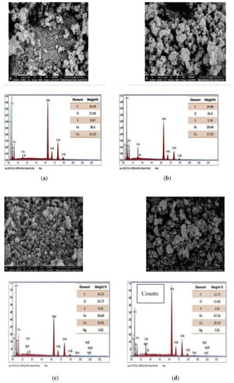 Field emission scanning electron microscopy (FESEM) before adsorption for CuFe2O4 (a) and (b) CuFe2O4@Polythiophene composite) and after Hg2+ adsorption (CuFe2O4 (c) and (d) CuFe2O4@Polythiophene composite).