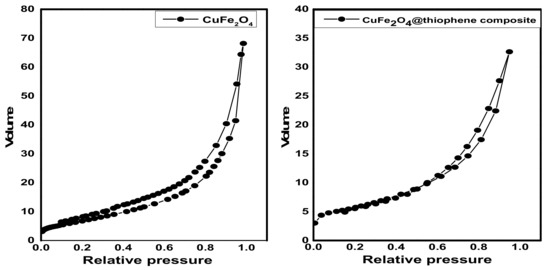 The surface area, pore size and pore diameter are estimated by Brunauer–Emmett–Teller (BET) method and illustrated in Table 1. As shown in Figure 4, it represents the N2adsorption–desorption isotherms at 77 °C on fabricated adsorbents. The adsorption isotherms of CuFe2O4 and CuFe2O4@Polythiophene composite are classified as type II with H3 hysteresis loop according to IUPAC which indicates un-restricted monolayer-multilayer adsorption and the sample was plate-like particles with slit-shaped pores.