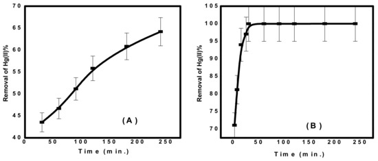 Heavy metal pollution in aqueous solution is a critical environmental problem [1,2]. Mercury is one of the most toxic pollutants for human and animals, even at low levels [3]. It is produced naturally from various natural sources such as volcanic eruption, weathering of rocks and soils [4]. It is also produced from different industrial sources such as pharmaceuticals, chloralkali, plastic, textile, paint, rubber, paper, cement, electronic industry, coal combustion, fertilizers, oil refining and rubber processing [5,6]. It exists in various forms such as metallic mercury, mercurous (Hg+), mercuric (Hg2+) and organic mercury containing phenyl, methyl and ethyl groups, etc. It causes various diseases such as Alzheimer’s disease, amyotrophic lateral sclerosis, Parkinson’s disease and damaging of the immune system and kidneys. Hence, mercury is considered as prior hazardous pollutant by the Agency for Toxic Substances and Disease Registry [7]. According to World Health Organization (WHO), 1 µg/L is the maximum permissible concentration of Hg(II)in drinking water [8]. According to the European Union (EU), the maximum acceptable level of Hg(II) is 5 µg/L for wastewater discharge [9,10,11].