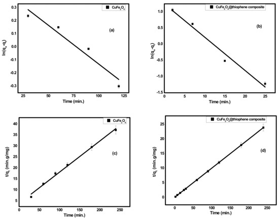 (a,b) kinetics plot of pseudo first order for adsorption of Hg(II) ions onto CuFe2O4 and CuFe2O4@Polythiophene composite; respectively and (c,d) kinetics plot of second order for adsorption of Hg(II) ions onto CuFe2O4 and CuFe2O4@Polythiophene composite, respectively.