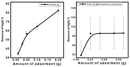 Different quantities of the prepared nanomaterials (0.01 to 0.2 g) were mixed with 50 mL (10 mg/L) Hg2+ solution at pH 6.0 and stirred. Figure 8 shows that the removal of Hg2+ increased from 35% and 92%, with 0.01 g adsorbent to 84.2% and 99.6% for 0.15 g of adsorbent using CuFe2O4 and CuFe2O4@Polythiophene composite, respectively. The optimum adsorbent dose was chosen to be 0.03 g for both sorbents.