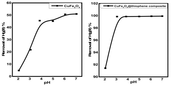The pH is an important factor for Hg2+ adsorption due to its relevance to Hg speciation, as well as the interactions between Hg species and adsorbent surfaces. However, the CuFe2O4/polythiophene particles prepared in this study exhibited negligible dependence on feed-water pH. When the feed water pH was varied from 3.0 to 7.0, Hg2+ removal efficiency of CuFe2O4/polythiophene particles remained at ~99% (Figure 9). At pH > 7, the Hg(II) ions convert to hydroxide species. For CuFe2O4particles the removal percentage of Hg(II) ions became constant in pH range of 6–7 for CuFe2O4. So that pH 6 was chosen for both sorbents.