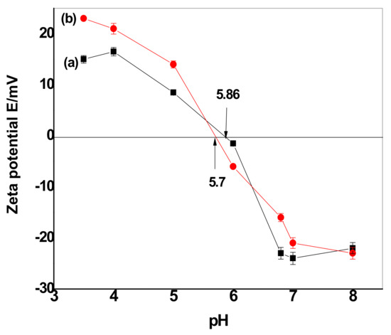 Based upon the zeta potential results (Figure 10), CuFe2O4 and CuFe2O4@Polythiophene particles prepared in this study had net negative charges at pH = 6.0 and 8.0 and positive charges at pH = 5.0. The surface charge properties of both CuFe2O4 and CuFe2O4@Polythiophene particles were studied by measuring zeta potentials of their aqueous dispersion at varied pH values. As shown in Figure 10, CuFe2O4 and CuFe2O4@Polythiophene particles had positive zeta potentials in the pH range of 3.5–5.0. When pH increased from 6.0 to 8, their zeta potentials decreased from 0 to −23 mV, suggesting that the CuFe2O4 particles became negatively charged at pH=6.0 be attributed to that at low pH, the oxygen-containing groups on the CuFe2O4 surface will form aqua complexes (i.e., M–OH2+) and give rise to the formation of positive charge, whereas at higher pH values, oxygen-containing groups (e.g., –OH) are ionized to –O–, forming negative charges on the CuFe2O4 surface.