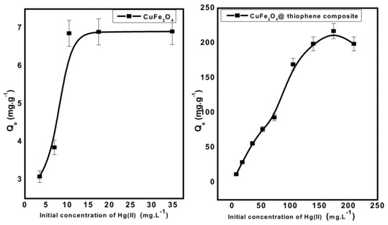 The effect of Hg(II) concentration at pH 6 was investigated under the optimized experimental conditions for both adsorbent types. Fifty-milliliter aliquots of Hg2+ solution at pH 6.0 was allowed to interact with 0.03 gm adsorbent dose for 30 min. As shown in Figure 11, the adsorption capacity (Qe) of both adsorbents increased gradually with increasing the concentration of Hg(II) until all active sites of each adsorbent were occupied and there weren’t any more active sites available to occupy. The maximum capacity per unit mass (Qm) of each adsorbent was 7 and 217 mg/g for CuFe2O4and CuFe2O4@Polythiophene composite, respectively. This confirms that CuFe2O4@Polythiophene composite is more favorable than CuFe2O4 for Hg(II) removal from aqueous solution. The promising adsorption performance of Hg(II) ions by CuFe2O4@Polythiophene composite arises from the soft acid–soft base strong interaction between sulfur group of thiophene and Hg(II) ions.