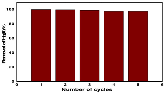 As shown in Figure 13, five adsorption–desorption cycles were carried out in order to examine the recyclability of CuFe2O4@Polythiophene composite and the removal percentage of Hg(II) was calculated by Equation (2). It was found that, there was not any obvious decrease in the removal efficiency after five cycles and the removal efficiency decreased gradually from 99.974% to 97.4% within consecutive cycles.