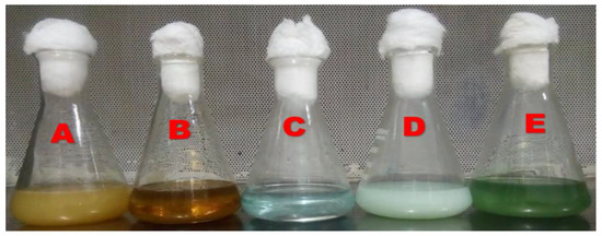 Observation of the color change in the reaction mixture of Pseudomonas fluorescens MAL2 during the biosynthesis of CuNPs: (A) P. fluorescens MAL2 in F-Base medium. (B) Cell-free extract supernatant. (C) CuSO4·5H2O solution. (D) One gram of cell pellet added to CuSO4·5H2O. (E) Color change in the reaction mixture from blue to dark green indicating the formation of CuNPs.