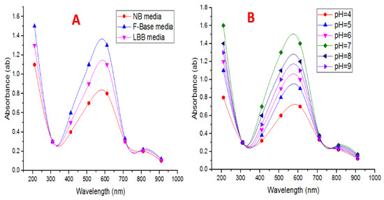 (A) UV–Vis spectra of medium type. (B) UV–Vis spectra of different pH values utilized throughout CuNPs biotransformation by P. fluorescens MAL2.