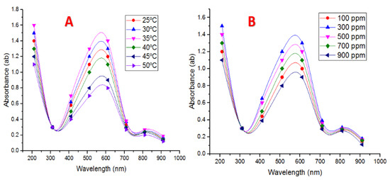 Six different temperature degrees were performed for studying this factor, i.e., 25, 30, 35, 40, 45, and 50 °C. It was easy to see that 35 °C was recorded to be the optimum temperature for the biotransformation of CuNPs by the tested Pseudomonas fluorescens MAL2 bacteria (Figure 3A). The obtained results proved that the increase in temperature reduced the production of CuNPs, and this reduction could have occurred because of the inactivation or degradation of biocompounds in the reaction mixture responsible for the bioreduction process. As the reaction temperature increased in the reaction mixture, both synthesis rate and conversion to copper nanoparticles in the medium increased [44].