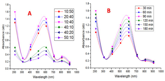 Time is an important feature that enhances NPs biotransformation and stability. From the reaction time experiment performed (30, 60, 90, 120, 150, and 180 min), it was seen that the absorbance of the reaction mixtures at 610 nm increased gradually up to 90 min, and then it started to decrease (Figure 4B). This trend suggests that CuNP biotransformation occurs, with an increase in reaction time; size reduction takes place, and CuNP biotransformation was performed under optimum conditions. To clarify the reaction time process, the UV–Vis absorption spectra were registered every 10 min [46].
