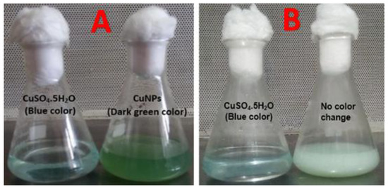 (A) Color change in the in the intensity of the reaction of CuNPs formation. (B) No color change occurs when 1 g of cell pellet is added to the CuSO4·5H2O solution.