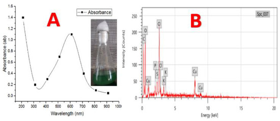 When a cell-free extract of Pseudomonas fluorescens MAL2 was added to CuSO4·5H2O solution in the growing flasks and left for incubation for 48 h, the reaction mixtures color changed from blue to heavy green (Figure 5A), proving the biotransformation of CuNPs. The analogous appearance of a dark green color solution due to the addition of 5 mM CuSO4 to a flask comprising Morganella sp., indicated CuNPs biotransformation [47,48]. When different concentrations of CuSO4·5H2O solutions were added to the pellet, no color change occurred (Figure 5B). The UV–Vis absorption spectrum of this reaction mixture exhibited a specific absorption peak in the range of 550 to 650 nm (Figure 6A), which can be attributed to CuNPs [49]. The exact position of Surface Plasmon Resonance (SPR) band may shift, which depends on the properties of individual nanoparticles, including size, shape, and capping agents [50].