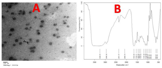 (A) TEM electron micrograph of the CuNPs. (B) FTIR analysis of the biotransformation CuNPs by P. fluorescens MAL2.