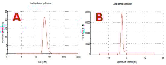 To observe the surface charges acquired by CuNPs, Zeta potential analysis was conducted, which can be performed to have clear prevision into the stability of the formed colloidal CuNPs. The magnitude of zeta potential gives an insight into inherent stability of colloid. It should be observed that the particles of CuNPs, with zeta potential values which were more positive than +30 mV or more negative than −30 mV, are deemed to be stable [56]. The zeta potential of the CuNPs in this study was found to be −26.00 mV (Figure 8B), and it can be inferred that the biotransformed CuNPs are very stable [57]. The electrostatic repulsive force between the NPs depends on the charge that resides on the surface of nanoparticles. When the charge of the nanoparticles is negative, it does not cause the aggregation of these nanoparticles, causing long-term stability.