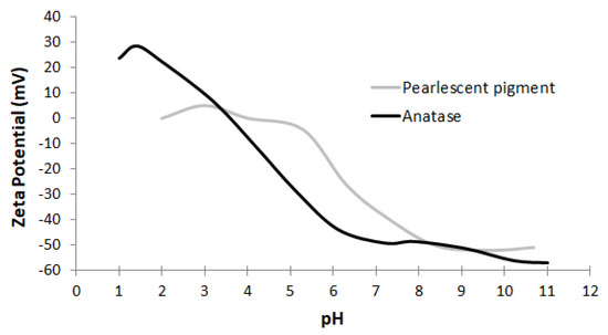 Zeta potential curves representative for the two groups of E171 materials, observed among the nine E171 materials obtained from webshops: pearlescent pigments and anatase TiO2.