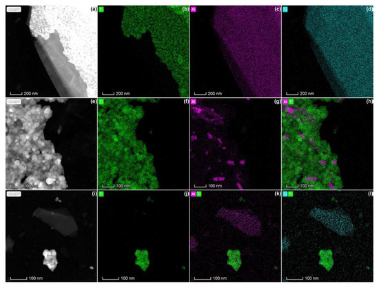 HAADF-STEM images (a,e,i) and corresponding spectral images of Ti (green), Al (pink), and Si (blue) obtained by EDX of pearlescent pigments, showing (a–d) aggregated TiO2 particles on top of mica, (e–h) a TiO2 aggregate containing small parts of mica, and (i–l) separate TiO2 aggregates and a mica flake.