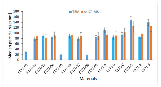 Table 6 and Figure 5 summarize the quantitative TEM measurements for all 15 E171 materials using optimized sample preparation protocols (P1 for pearlescent pigments and P6 for the anatase E171 materials and rutile material E171-F) and image analysis settings. The corresponding number-based distributions are given as supplementary material (Figure S3).
