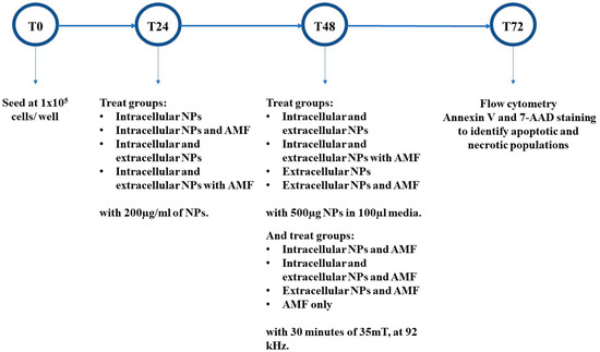 Summary of in vitro magnetic hyperthermia protocol. BxPC-3 cells are seeded at time zero (T0). Cells to contain intracellular nanoparticles are treated with 200 µg/mL at 24 h (T24). At 48 h (T48), cells exposed to extracellular nanoparticles are treated with 500 µg of nanoparticles in 100 µL media, and cells to be treated with magnetic fields, are exposed to 35 mT at 92 kHz for 30 min. Finally, at 72 h (T72), all treatment groups are stained with annexin V and 7-AAD and analysed by flow cytometry for detection of apoptotic and necrotic cells. Abbreviations: NPs, nanoparticles; AMF, alternating magnetic field.