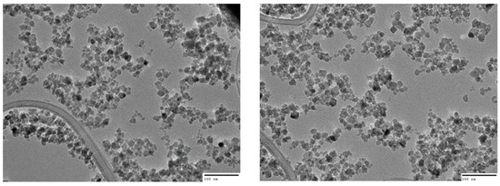 Representative TEM images of fluidMAG/C11-D nanoparticles. Captured with the JOEL 2100 (JOEL, Tokyo, Japan) at an acceleration of 200 kV and a beam current of 100−110 µA. Scale bar: 100 nm.