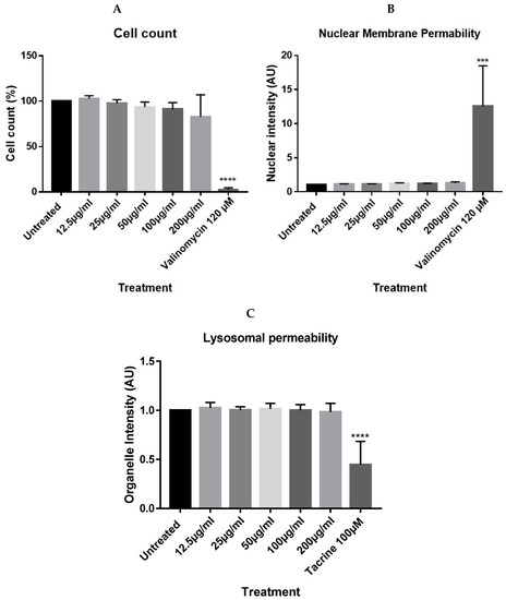 Results acquired from the multiparametric analysis of the high content screening experiments showed no significant changes to the cell count, nuclear membrane permeability, or lysosomal permeability parameters after 72 h treatment of up to 200 µg/mL of nanoparticles against the untreated negative control, while positive controls (tacrine and valinomycin) quantitatively and visibly reduced cell count and lysosomal mass, while increasing nuclear permeability (Figure 3 and Figure 4).