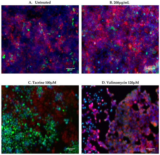 Representative merged images of BxPC-3 cells following treatment. Merged images of untreated (A), 200 µg/mL treated (B), and treated with tacrine (C) and valinomycin (D) positive controls. Scale bar: 100 µM. Both untreated and 200 µg/mL treated images depict high cell numbers and little green dye located in the nucleus of cells while background levels of red dye consistent between each group. Tacrine and valinomycin-treated cells on the other hand have a visibly lower cell count and both have a high presence of green dye in the nucleus. Additionally, tacrine treated cells have a lower incidence of red dye indicating lysosomal damage to these cells, as previously reported in [23].