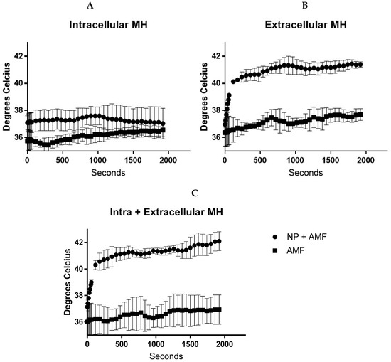 Temperature graphs of magnetic hyperthermia with BxPC-3 cells. Intracellular and magnetic field only cells remained at biologically viable temperatures (A). Extracellular nanoparticles successfully generated temperatures required for mild hyperthermia (B) and (C). Abbreviations: NP, nanoparticles; MH, magnetic hyperthermia; AMF, alternating magnetic field.