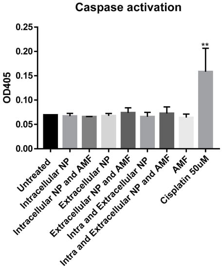 Caspase activation with BxPC-3 cells following magnetic hyperthermia treatment. Results are from four individual experiments, of which two experiments are pooled together to get the desired concentration of protein required for the assay. Values are a result of absorptions at 405 nm. Significance is against the untreated. Significance was assessed using one-way ANOVA followed by Dunnett’s test. Abbreviations: NP, nanoparticle; Intra, intracellular; Extra, extracellular; AMF, alternating magnetic field. Error bars = standard deviation. ** p < 0.01.