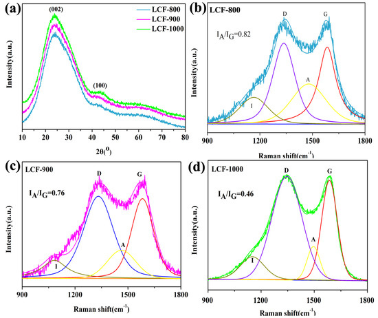As can be observed from Figure 2a, all the samples showed two broad diffraction peaks at 24 and 44° corresponding to the (002) plane of graphitic carbon and the (100) plane of amorphous carbon, respectively. This indicates that the LCF mats showed a highly amorphous structure. These two peaks confirm the conversion of lignin into carbonaceous materials [25]. The deconvoluted Raman spectrum of LCFs shows an impurity band (I) at 1140 cm−1, a disordered graphitic band (D) at 1348 cm−1, an amorphous band (A) at 1484 cm−1, and an ordered graphitic band (G) at 1585 cm−1 [26,27]. The A/G band intensity ratio of carbon materials is a measure of their amorphous degree [28]. The IA/IG values of LCF-800, LCF-900, and LCF−1000 were 0.82, 0.76, and 0.46, respectively, indicating that the amorphous degree of LCF-800 was higher than those of LCF-900 and LCF-1000. This is consistent with the results reported by Chatterjee et al. [29]. These results suggest that the carbonization temperature is the key factor affecting the morphology and structures of LCFs. The average diameter and amorphous degree of the LCFs decreased with an increase in the carbonization temperature. LCFs with high amorphous degrees provide significantly larger transport channels for electrolyte ions than those with graphitized structures. These transport channels increase the rate of ion diffusion through the electrode [30].