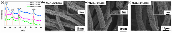 XRD patterns of the MnO2-LCF mats (a); SEM images of the MnO2-LCF-800 (b), MnO2-LCF-900 (c), MnO2-LCF-1000 mats (d).