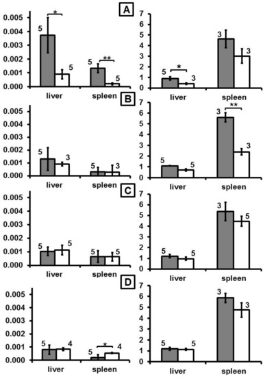 The time-dependent organ distribution fluorescence of the dye DY-555 attached to the MNP and the iron concentration in the organs. (A)–(D): 0, 2, 4, and 6 months after MNP injection in mice, respectively. Left panel: semiquantitative fluorescence intensity (em: 573 nm, arbitrary units per s, n = 5); right panel: iron content (mg iron per g tissue, n = 3). Gray and white bars: after MNP injection or native controls, respectively. Nude mice were injected with dually-labelled MNP-D(DY-730)-PEG-5kDa(DY-555) (200 µmol Fe/kg body weight). At the defined time points, animals were killed and semiquantitative fluorescence intensities of each fluorochrome in excised organs was determined. ROI: 916 pixels, n = 5, mean and standard deviation of the mean, * p < 0.05; ** p < 0.01; Tukey post-hoc Test.