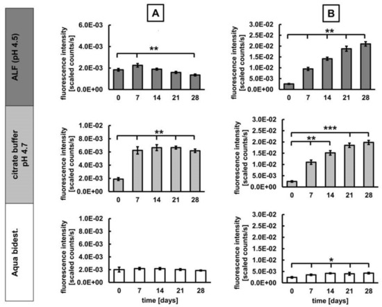 With regard to the NMP´s spectroscopic behavior in different biological media, we observed the following: In ALF medium, a transient increase of DY-730 fluorescence was seen at days of incubation (p < 0.05), whereas the increase of DY-555 fluorescence was much more prominent (p < 0.01). The citrate buffer control showed a prominent dye DY-730 fluorescence increase, which indicates that the presence of endo-lysosomal metabolites attenuated dye hydrolysis. Moreover, citrate iron chelation in the acidic environment (high proton concentration) favored fluorescence emission of DY-730, but had almost no effect on the DY-555 fluorescence. In water (low pH control), DY-730 fluorescence remained unchanged, but fluorescence of DY-555 increased (p < 0.05) with increasing time of incubation (Figure 4).