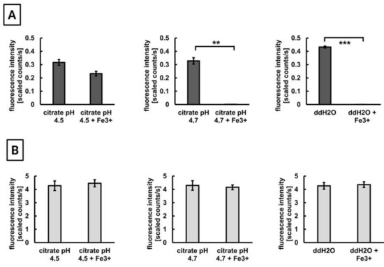 The fluorescence emission (755 nm) of DY-730 (A) is susceptible the presence of free Fe-ions whereas that of DY-555 (573 nm) (B) is not. Semiquantitative analysis of fluorescence intensity of the dyes after suspension in artificial lysosomal fluid—left, CB (citrate buffer)—center, or ddH2O (control)—right. 15 nmol dye in 2 mL suspension medium, in presence or not of 1 mmol Fe3+ and measurement of fluorescence intensity (ROI: 3346 pixel) immediately thereafter, mean and standard deviation of the mean, ** p < 0.01; *** p < 0.001.