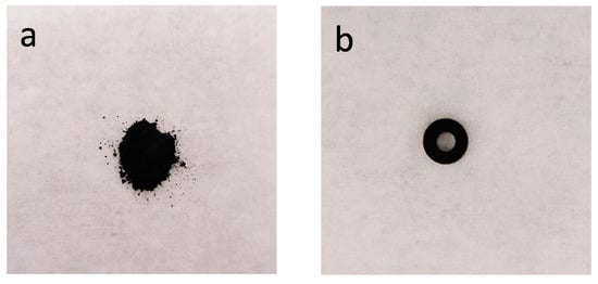 (a) The photo of FeNi3@C pristine powder. (b) The photo of FeNi3@C/paraffin ring-shaped sample.