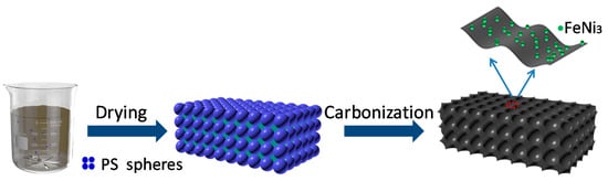 Figure 2 is a schematic illustration of the whole preparation process of the 3D honeycomb-like FeNi3@C composites. The PS spheres were synthesized via an emulsion polymerization method, and then a precursor template was used. The PS spheres, C10H10Fe, C10H10Ni, and PVDF were added to the THF solvent; the mixture was then sequentially dried and carbonized. PVDF serves as a carbon source and a binder to connect the spheres during the drying process, and this causes the metal cations to be evenly distributed in the space of spheres. During the final carbonization process, PS spheres were removed to produce nanoscale pores. Simultaneously, PVDF decomposed and formed a carbon matrix. With prolonged heating, the Fe/Ni-based oxides that were produced during the early stage were reduced by H2 to the corresponding metals [,]. The reaction of intermetallic FeNi3 can be simply described as follows []: Fe + 3Ni→FeNi3.