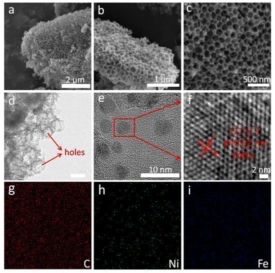 Scanning electron microscopy (SEM) and HRTEM were used to assess the microstructure of the as-prepared FeNi3@C product. Notably, all the samples showed a 3D honeycomb-like structure with no obvious differences (Figure S1a–d). Therefore, taking S2 sample as an example, the microstructure analysis is discussed. As shown in Figure 3a–c, nanopores are distributed uniformly and in an orderly manner in the carbon matrix under different magnifications. The average size of the pores is about 130–150 nm, with mainly controlling from the PS spheres. There is no doubt that this unique porous structure will enhance the scattering of EM waves, thus facilitating the enhancement of MA properties, which have been proved []. Figure 3d,e represent typical TEM images of sample S2, in which the FeNi3 nanocrystals are well coated by a honeycomb-like carbon layer. The ultrafine nanocrystals are sphere-like and the average size of particles is 5–7 nm. In Figure 3f the periodic fringe spacing is 0.02 nm, which can be assigned to the (111) plane of FeNi3. Figure 3g–i shows EDS mapping of S2. The results indicate that Fe, Ni, and C were well distributed, and this is in good agreement with the XPS analysis.