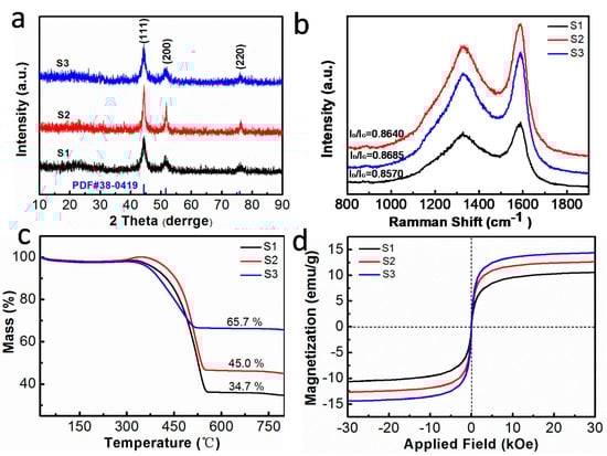 (a) XRD patterns of the S1, S2, and S3 samples. (b) Raman spectra of the S1, S2, and S3 samples. (c) Thermogravimetric (TG) curves of all of the samples under an atmosphere of air. (d) Hysteresis loops of the S1, S2, and S3 samples.