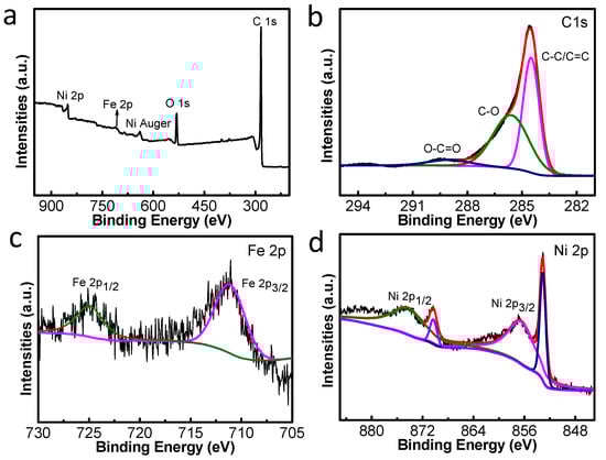 The XPS measurements were used for further analyzing the surface chemical compositions and elemental valence states of the samples. The presence of Fe, Ni, and C in the synthesized FeNi3@C composites was confirmed by the spectrum of the survey scan (Figure 5a). The survey scan shows five peaks with binding energies of approximately 285, 531, 641, 712, and 856 eV, and these are assigned to C 1s, O 1s, Ni Auger, Fe 2p, and Ni 2p, respectively. These indicate the presence of C, O, Fe, and Ni in the sample. The existence of oxygen may be due to the fact that the original material PVDF contains some oxygen-containing functional groups []. However, we did not find oxygen element in the EDS mapping, indicating that the oxygen content in the sample is extremely low. The C1s spectrum (Figure 5b) can be split into three peaks that are located at 284.6, 286.3, and 288.8, and these correspond to C − C/C = C, C − O, and O − C = O, respectively. Figure 5c displays the Fe 2p spectrum of S2, and it can be fitted by two peaks. One peak at 711.6 eV corresponds to Fe 2p3/2 and one peak at 724.5 eV corresponds to Fe 2p1/2. As seen in Figure 5d, the fitting peak with binding energies of 856.5 and 874.3 eV should be assigned to Ni 2p3/2 and Ni 2p1/2, respectively. Also, the peaks at 853.1 and 870.3 eV can be attributed to the Ni 2p3/2 and Ni 2p1/2 of Ni2+ states, respectively [].