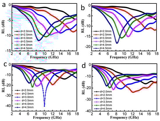 Calculated reflection loss (RL) curves of the S2–paraffin composites with different absorber thicknesses: (a) S2–10 wt%, (b) S2–20 wt%, (c) S2–30 wt%, and (d) S2–40 wt%.