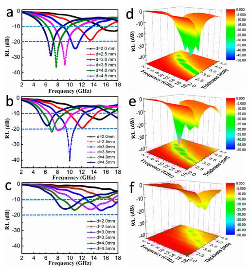 Figure 7 presents RL curves for S1, S2, and S3 at various thicknesses, each with filler loadings of 30 wt%. It is clear that with an increase in thickness, the RL peaks move toward the lower frequency region, and this is consistent with other reports [,]. All samples are consistent with quarter-wavelength matching model, where the relationship between sample thickness (d) and absorption peak frequency (f) can be expressed as the following equation []: