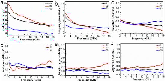 (a) Real and (b) imaginary parts of complex permittivity for S1, S2, and S3. (d) Real and (e) imaginary parts of complex permeability for S1, S2, and S3. (c) Dielectric loss tangents and (f) magnetic loss tangents of S1, S2, and S3.