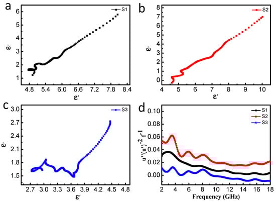 where is static permittivity and is relative permittivity at the high-frequency limits. Each semicircle in the curve of is generally denoted as the Debye or Cole–Cole semicircle. There are different numbers of distorted Cole–Cole semicircles belonging to S1–S3, and each semicircle corresponds to one Debye dipolar relaxation process. This reveals that carbon source content will influence the Debye relaxation process due to different matching between the and values. These results well confirm that the dielectric loss in the 3D honeycomb-like FeNi3@C composites mainly comes from multiple-relaxations. It can be found more Cole–Cole semicircles of S2 and S3, compared to ones of S1. It is widely accepted that dielectric losses are not the only determinant in the evaluation of MA performances in ferrite-carbon composite absorbers []. Permeability and magnetic loss also need to be analyzed, which are the other crucial factors responsible for MA performances. The excellent performance of S2 benefits from the combined effect of dielectric loss and magnetic loss.