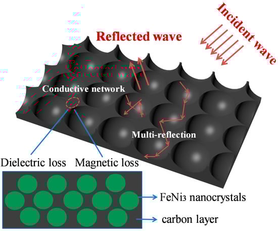 Based on the above, the S2 sample has excellent MA properties and a broad bandwidth as a result of the synergistic effect between the dual loss (dielectric and magnetic loss) of the carbon layer and FeNi3 nanocrystals. However, beyond that, the unique structure also contributes to the improved MA properties. In Figure 10, when incident microwave penetrates into the absorbent, multiple reflections and scatterings occur in the 3D honeycomb-like structure, and this extends the propagation of the microwave pathway to largely attenuate the incident EM wave [,,]. Dielectric loss is induced in dipole polarization and interfacial polarization, and these are respectively caused by a large number of defects and interfaces. Also, the 3D honeycomb-like structure forms a conductive network which is good for improving electrical loss. As expected, the 3D honeycomb-like FeNi3@C composites exhibit optimum MA performance.