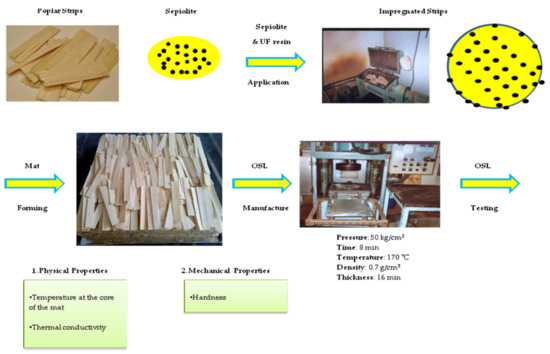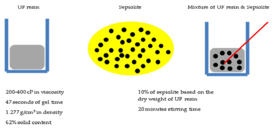 Sepiolite was mixed with UF resin for 20 min, using a magnetic stirrer, to make sure that sepiolite nanostrands were evenly mixed with the resin. Once resin and nano-sepiolite were mixed, the mixture was sprayed onto wood strips in a rotary drum. Ten percent of sepiolite was mixed with the resin, based on the dry weight of the UF resin. The flow diagram of this experimental design is presented in Figure 1.