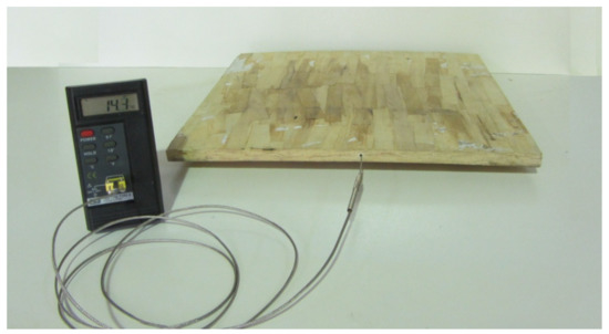 The temperature at the core section of the mat was measured, with 0.1 °C precision, with a digital thermometer with a temperature sensor probe at 5 s intervals (Figure 2). The probe was inserted, in the horizontal direction, for approximately 50 mm into the core of the mat. Temperature measurement was begun immediately after the hot plates reached the stop-bars. This procedure was also applied by other researchers [37,38,39].