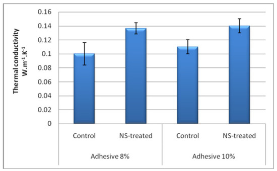 SEM imaging of sepiolite showed sepiolite nanostrands with a mean aspect ratio of 1:15 (Figure 5). The results of the thermal conductivity coefficient measurement revealed that the highest and lowest values were observed in Adh10-NS and Adh8 panels, respectively (Figure 6). The addition of sepiolite increased thermal conductivity in panels with 8% and 10% adhesive contents by 36% and 40%, respectively. The increase in thermal conductivity was mainly attributed to two basic reasons. Firstly, the addition of sepiolite with a mineral nature and high hardness acted as an effective resin filler. Similarly, the improving effect of other minerals (nano-wollastonite) was previously reported to increase the mechanical performance in composite panels, and also to improve the shear strength of UF resin [41]. The addition of sepiolite was also reported to increase thermal conductivity in polypropylene-based wood–plastic composites, though the thermal conductivity of sepiolite itself is not very high [42]. The thermal conductivity of sepiolite was measured in the present study to be 3.90 ± 0.31 (W·m−1·K−1) using the same procedure and apparatus. The thermal conductivity of sepiolite is much higher than wood, which is reported to be 0.16 and 0.12 (W·m−1·K−1) for hardwoods and softwoods, respectively [43]. The thermal stability of polylactide/sepiolite nanocomposites was also improved by introducing sepiolite into the composite [25]. These increases were attributed to sepiolite acting as a cross-linking agent in the composite polymer matrix, ultimately improving the overall integrity of the whole composite. In the present study, the improved integrity in the whole OSL composite eventually resulted in an improvement in thermal conductivity (Figure 6). Similar improvements in integrity and mechanical strengths of composites and resins were previously reported to be achieved by the addition of different minerals at nano- and microscales [36,38,44]. Wollastonite was also reported to improve thermal conductivity in medium-density fiberboard and OSL panels, through which physical and mechanical properties were eventually improved [14,38,44]. Wollastonite also improved the shear strength of polyvinyl acetate resin, as a popular resin in the wood-working industry [41]. The cited authors attributed the improvement to the wollastonite nano-fibers, acting as a hard filler and supporting the whole resin and composite matrix as a strong scaffold. With regard to the fact that the addition of any materials may change the chemical behavior and curing time of a resin, further studies should be carried out to chemically investigate the effects of addition of nano-sepiolite at different content levels on the curing time of UF resin.