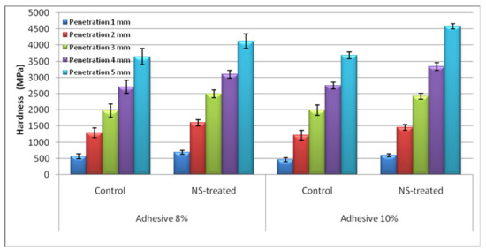 Measurement of hardness did not show significant difference between the control panels with 8% and 10% of adhesive contents (Figure 8). In some cases, hardness in Adh8% panels was even higher, though not statistically significant. This indicated that the increase in resin content from 8% to 10% did not have a significant effect on the hardness property. Similar results were reported in OSL panels containing wollastonite [45]. The cited authors expressed compactness as the decisive factor on the mechanical properties of OSL panels, rather than adhesive content. However, the addition of sepiolite significantly increased hardness values in all penetration depths. Hardness slightly increased as sepiolite content increased. Considering the fact that the amount of sepiolite used in panels was very small, and therefore it could not physically have an impact on the hardness increase, the increase in hardness was attributed to the improvement in the thermal conductivity of the panels. This improvement, in turn, may have facilitated the resin-curing process, eventually increasing the hardness. However, further studies should be carried out in future on resin-curing to have a better understanding on how sepiolite chemically affects UF-resin. Chemical studies like resin-curing and FTIR would possibly explain why the increases in hardness values were so low, contrary to some previous studies demonstrating the high impact of low amounts of nanofillers on different properties of resins and adhesives [46,47,48,49].