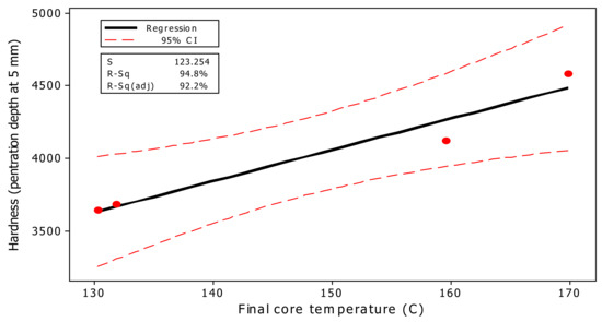 Fitted-line plot between hardness (at 5 mm depth of penetration) versus final core temperature ºC (at 480 s) for the four treatments studied in the present project.