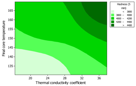Surface analysis (A) and contour plot (B) among hardness (at 5 mm depth of penetration), versus final core temperature (at 480 s) and thermal conductivity coefficient.