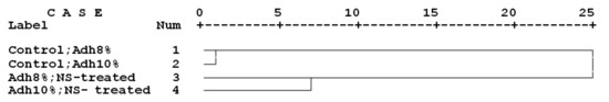 Cluster analysis of the four treatments based on thermal conductivity coefficient, final temperature, and hardness values (Adh = adhesive content; NS = nano-sepiolite).