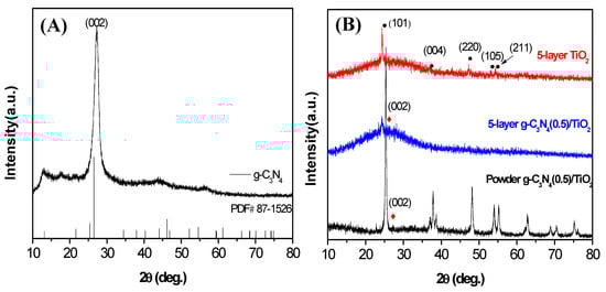 Figure 1A shows XRD patterns of the synthesized g-C3N4 and two distinct diffraction peaks at 12.9° and 27.6°, corresponding to the (100) and (002) crystal planes of g-C3N4 (PDF#87-1526) []. The same diffraction bands were also observed on other g-C3N4-containing samples. As for the TiO2-containing photocatalysts (Figure 2B), the characteristic signals of anatase phase TiO2 (PDF#21-1272) are presented, and no characteristic peaks associated with the rutile phase are observed in any of the samples. Compared with the 5-layer g-C3N4(0.5)/TiO2, the peak of powder g-C3N4(0.5)/TiO2 has much sharper (101), (004), (200), (105), (211), crystal planes that all corresponds to clear peaks, which indicates the latter has higher crystallinity []. However, it is difficult to observe the clear diffraction bands from g-C3N4, which should be resulted from its low quantity and high dispersion in the thin film.
