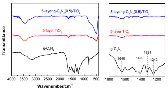 The FT-IR spectra of the prepared photocatalysts are shown in Figure 2. Characteristic peaks at 1640, 1409, 1321, and 1242 cm−1 can be clearly identified on g-C3N4, which are assigned to the stretching vibration of the aromatic CN heterocycle []. Additional peaks at 809 and 3100–3500 cm−1 can be attributed to the typical triazine ring vibration and the stretching vibration of N2H- and –OH []. As for 5-layer TiO2, the peaks at about 3400 and 1630 cm−1 are assigned to the bending and stretching vibration of OH from the adsorbed water, respectively, which is similar with the previous report []. Additionally, the characteristic absorption peak of the TiO2 thin film detected in the wavelength range of 450–700 cm−1 may be attributed to the stretching vibration of the Ti–O–Ti bond []. Only weak characteristic peaks of the g-C3N4 in 5-layer g-C3N4(0.5)/TiO2 are detected in the FT-IR spectrum due to its low quantity.